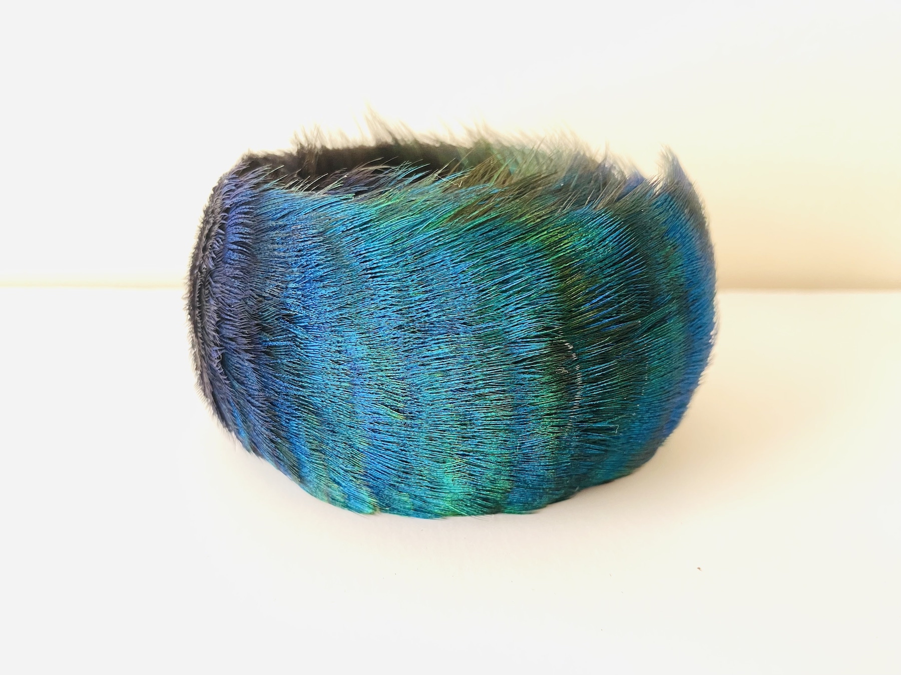 Huang is a master of the laborious technique where each single feather is individually tied to a textile net base. Feathers are sustainably sourced from moltings and other harmless means of gathering. Before Huang even begins creating, the feathers must be carefully washed, cleaned and dried. Feathers from different parts of the bird have different qualities and these subtle variations become the basis for aesthetic decisions.