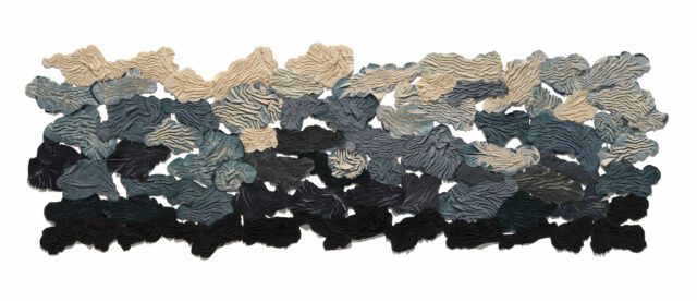 Stitched, manipulated, and heat set, transfer-printed, synthetic felt made from re-cycled plastic bottles, 34″ x 108″