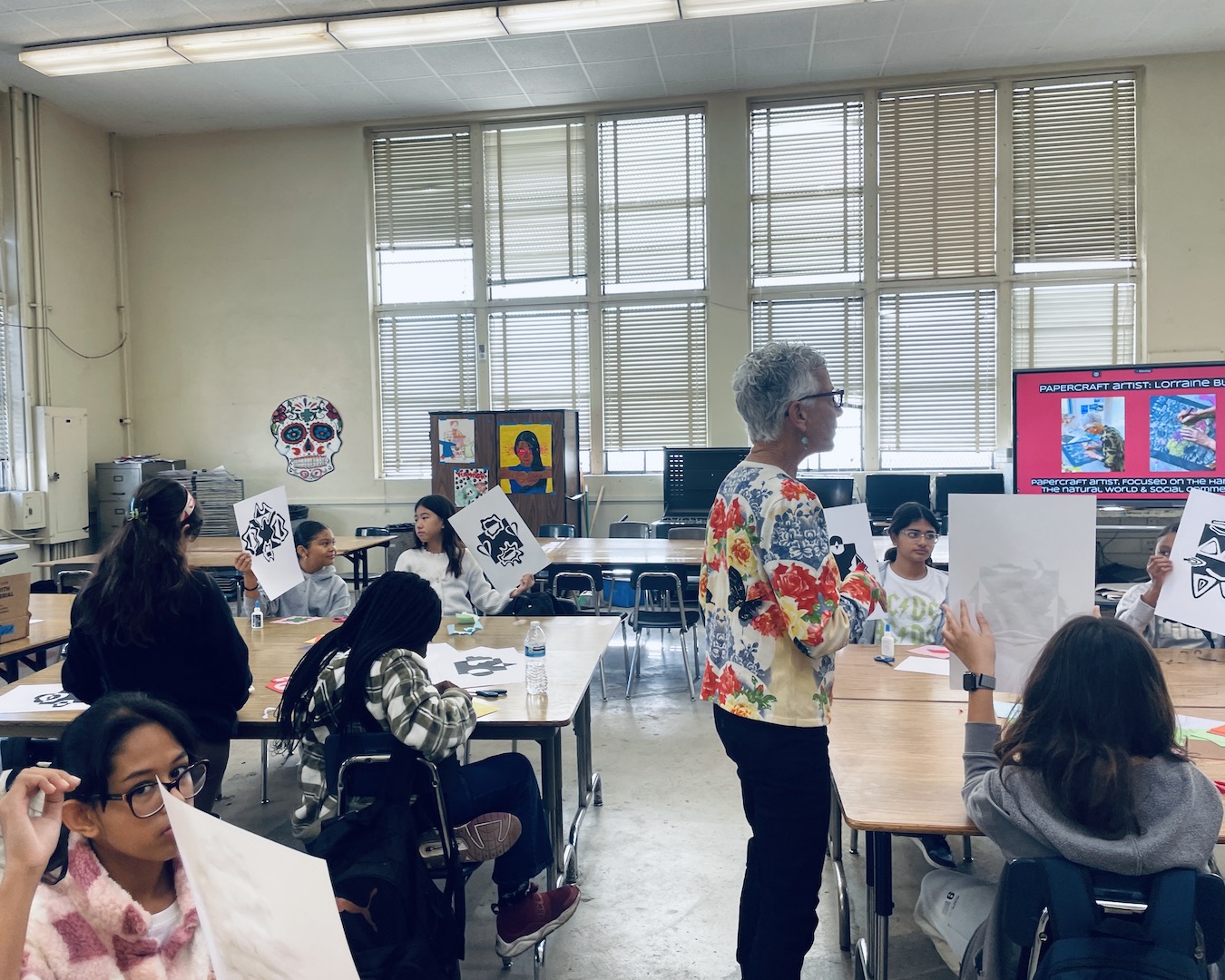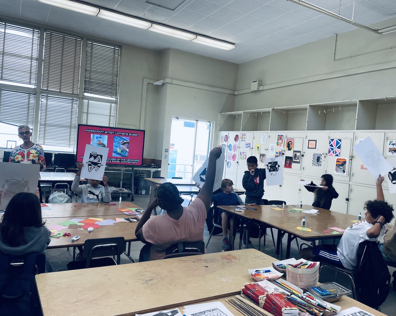 This Fall our K-12 Los Angeles Craft in Schools program collaborated with our featured exhibiting papercut artist, Lorraine Bubar. Bubar’s art teacher background, and dynamic artist’s journey through animation, painting and paper-cut art worlds piqued many students’ curiosities. She shared about her artist’s journey, from animation and illustration commercial work, towards art-teaching LA high schoolers, airbrush painting, and now focusing on handmade-paper collage and papercutting techniques.