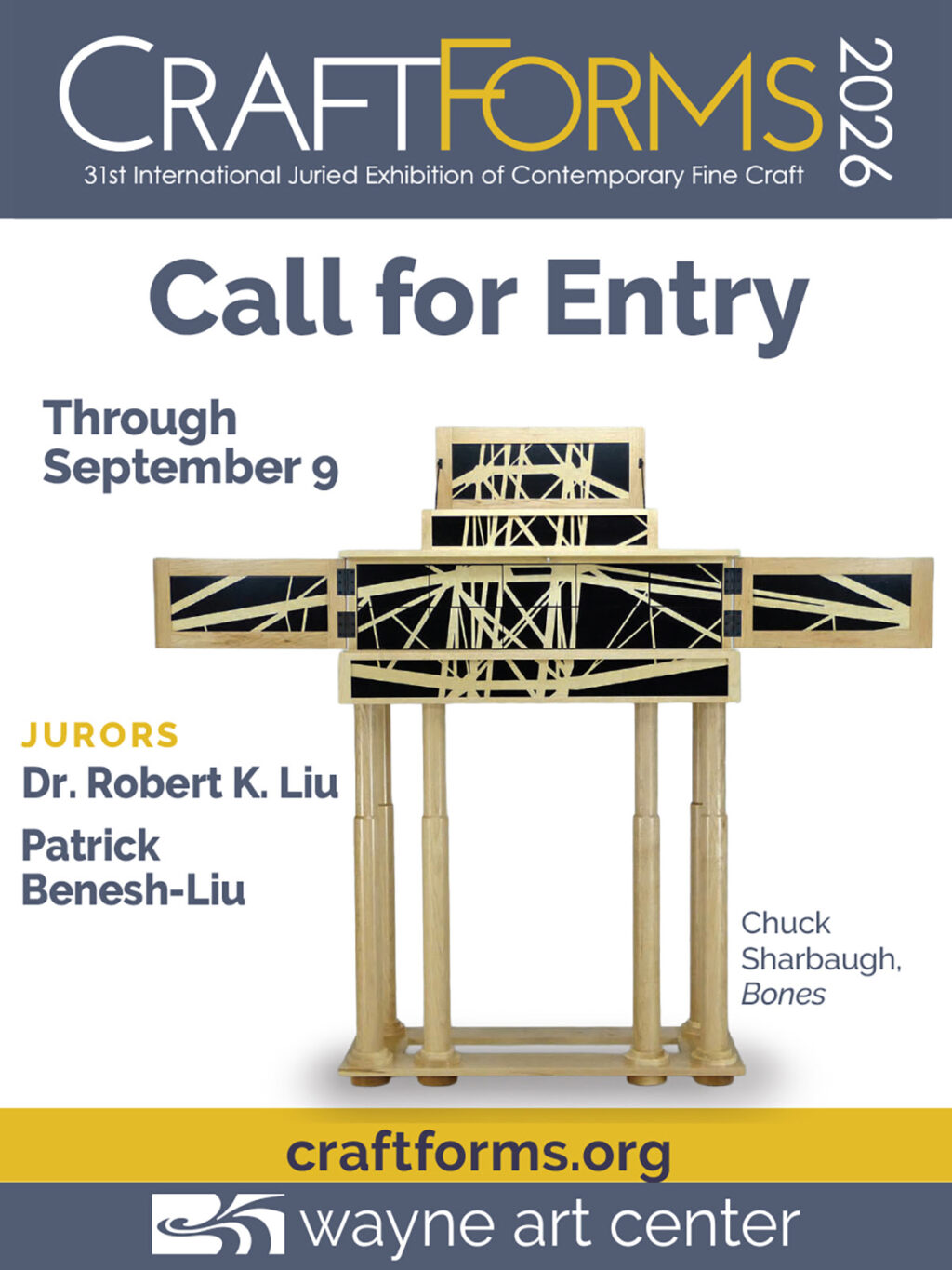 Wayne Art Center seeks submissions for the 31st International Juried Exhibition of Contemporary Fine Craft, in the following mediums: basketry, ceramics, fiber, furniture, glass, jewelry, metal, mixed media, paper, wearable art, and wood. Works created utilizing CAD/CAM technologies and 3D printing tools are also eligible.